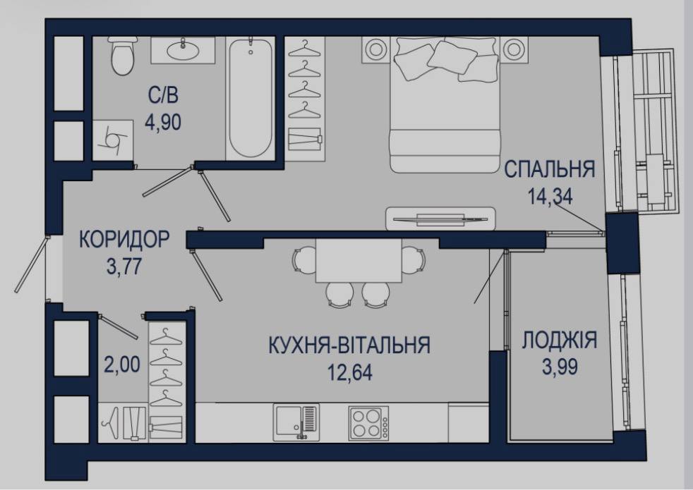 Хороше планування, кухня з лоджією, окрема спальня, суміжний санвузол та гардеробна.